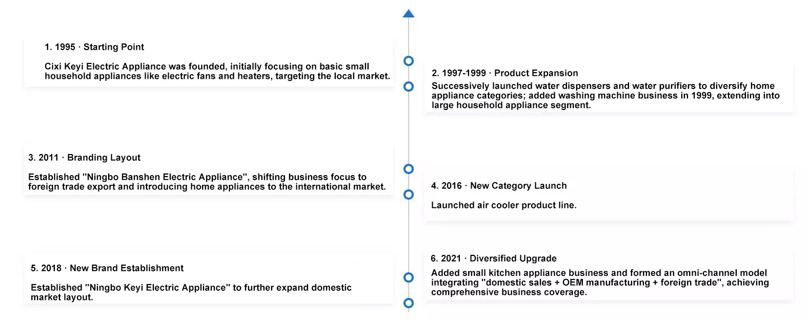 Onlarca yıllık istikrarlı gelişmeyle, Ningbo Keyi Electric Appliance Co., Ltd. aşağıdaki yolculuğa çıktı: 1995 yılında, başlangıçta yerel pazara odaklanan ve esas olarak elektrikli fanlar ve ısıtıcılar gibi küçük ev aletleriyle ilgilenen Cixi Keyi Electric Appliance kuruldu.